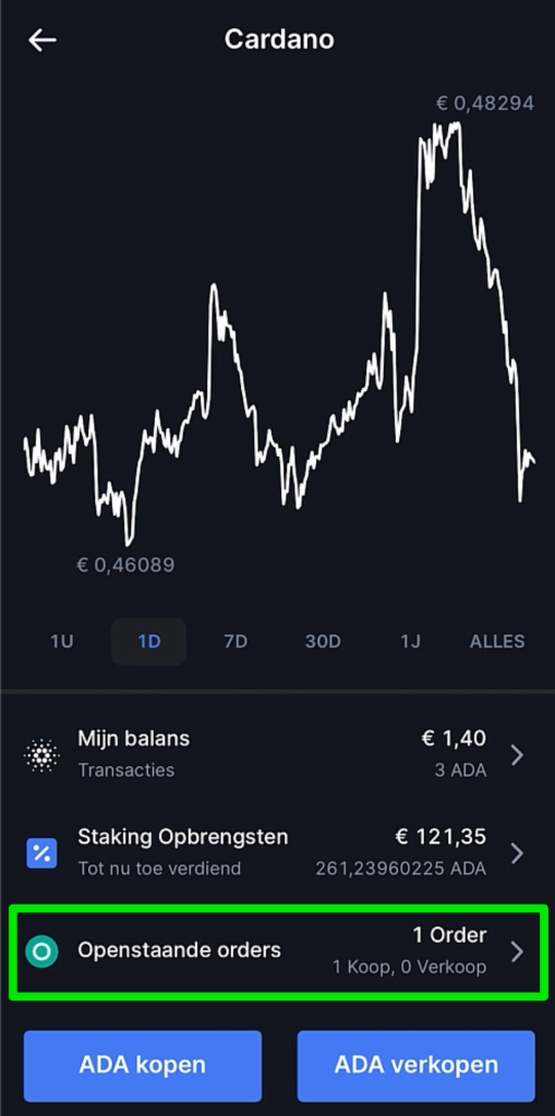 Wanneer je limiet orders hebt geplaatst in Bitvavo, heb je ook de mogelijkheid om deze te bekijken en eventueel te annuleren. Wanneer ik bijvoorbeeld naar Cardano ga kan ik direct zien dat ik openstaande orders heb.