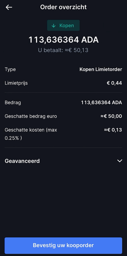 Limietprijs: Hier geef je bij een kooporder de prijs aan waarvoor je de munt wil kopen. Dit bedrag is normaliter onder de huidige koersprijs, want anders koop je het direct. Wanneer Cardano bijvoorbeeld op €0,46 staat en je wil het voor €0,44 pas kopen, dan vul je hier dus 0,44 in.