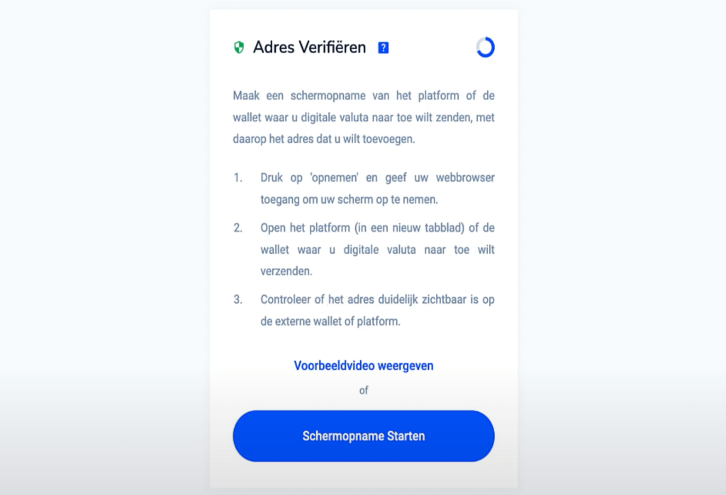 Je krijgt nu te zien dat je een schermopname moet gaan maken om het adres te verifiëren. Dit doe je door het adres te tonen in je browser. De schermopname start je ook via de browser. Je hoeft hier geen extra software voor te installeren. Door de schermopname weet Bitvavo zeker dat het adres juist is en van jou.