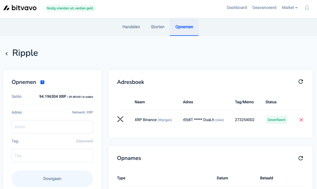 Wanneer je account is aangemaakt kunnen we alles gaan overzetten. In dit artikel ga ik als voorbeeld XRP versturen van Bitvavo naar Binance. De uitleg is echter ook geschikt voor andere cryptomunten. Wil je bijvoorbeeld Bitcoin van Bitvavo naar Binance versturen, dan kan dit op precies dezelfde manier.