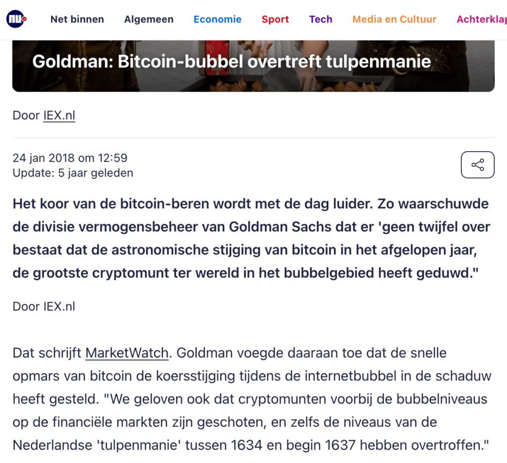 Zo zie je regelmatig in de media dat Bitcoin een bubbel is. Een bubbel die zelfs de tulpenmanie overtreft als we Goldman mogen geloven.